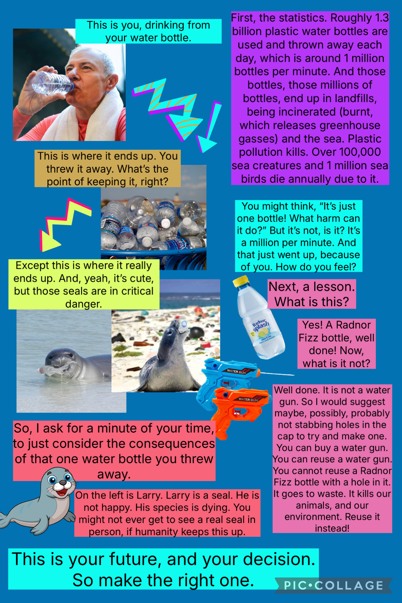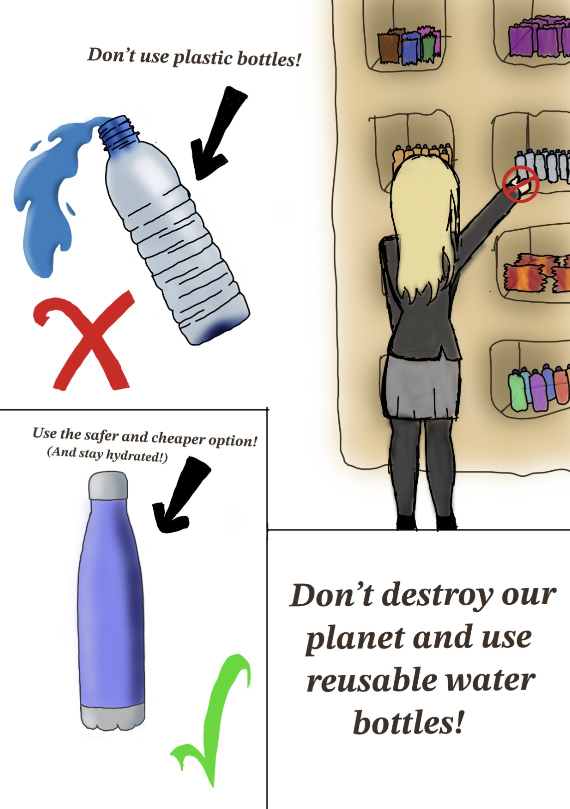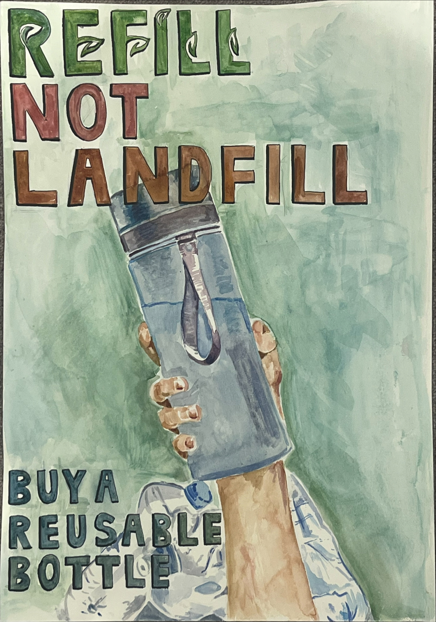 We would like to extend a big thank you to the 68 students who entered. We loved looking at their brilliant posters. Many entries featured catchy slogans and lots of interesting facts about why we need to refill our water bottles instead of buying new ones every day. It really was very hard to make a decision.