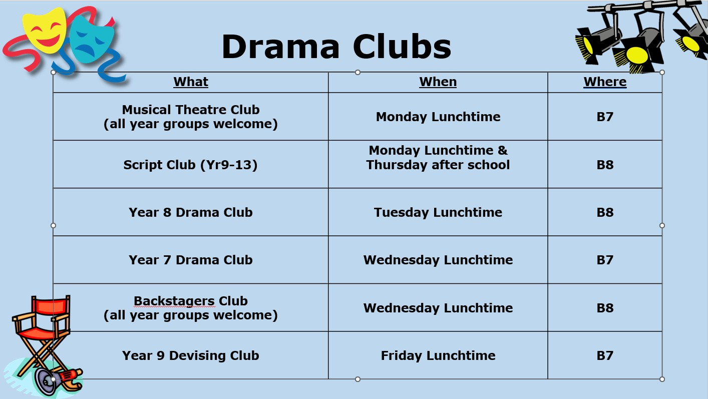 Composition Club (C8) Y7 Drama Club (B7) Backstagers club (B8) |