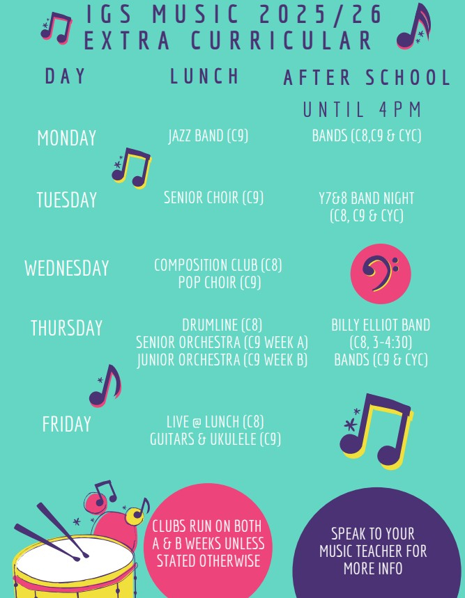 This new concert series provides a platform for IGS student musicians to perform in a friendly, informal setting at lunchtime. Taking place every Friday lunchtime in C8 for Year 7-11 and 13 and Monday lunchtime for Year 12 students.