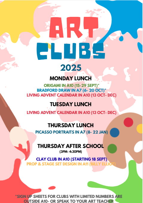 *due to limited spaces, all themed Art clubs require students to sign up in advance. Sign up sheets are outside A10 on A Floor or speak to your Art teacher for more information.